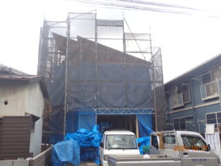 足立区本木 建替え工事。足立区注文住宅建替え&リフォーム工務店あなたの担当がいる浅野工務店の藤田です。先週末は、不安定な天候でしたが、予定より1日遅れで、建て方完了しました。60坪ほど大きさあるので、大工さん3人・鳶さん3人で2日かけて上棟し、屋根のルーフィング張り,ブルーシート養生まで無事、終えました。・・・