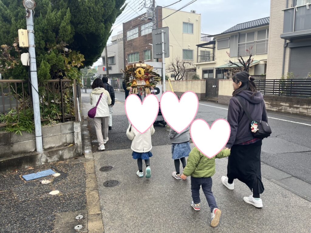 古い熊手を納めるために吉川君が担いでいる後を
