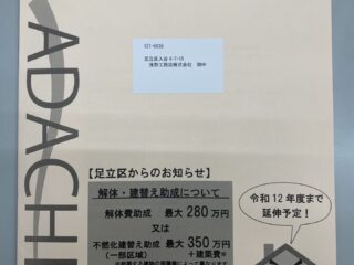 本日、足立区さんから封筒で届きました。予てよりお問い合わせのあった不燃化特区制度の解体・建替え助成についての今後の予定ですが令和12年度まで延伸予定!という通知が届きました。正式な決定は令和7年度末になるとのことですが延長することになったそうです。ご心配いただいていた方々は本当・・・