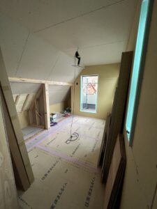 現場では、大工さんがフローリングや扉の枠を設置しています🔨