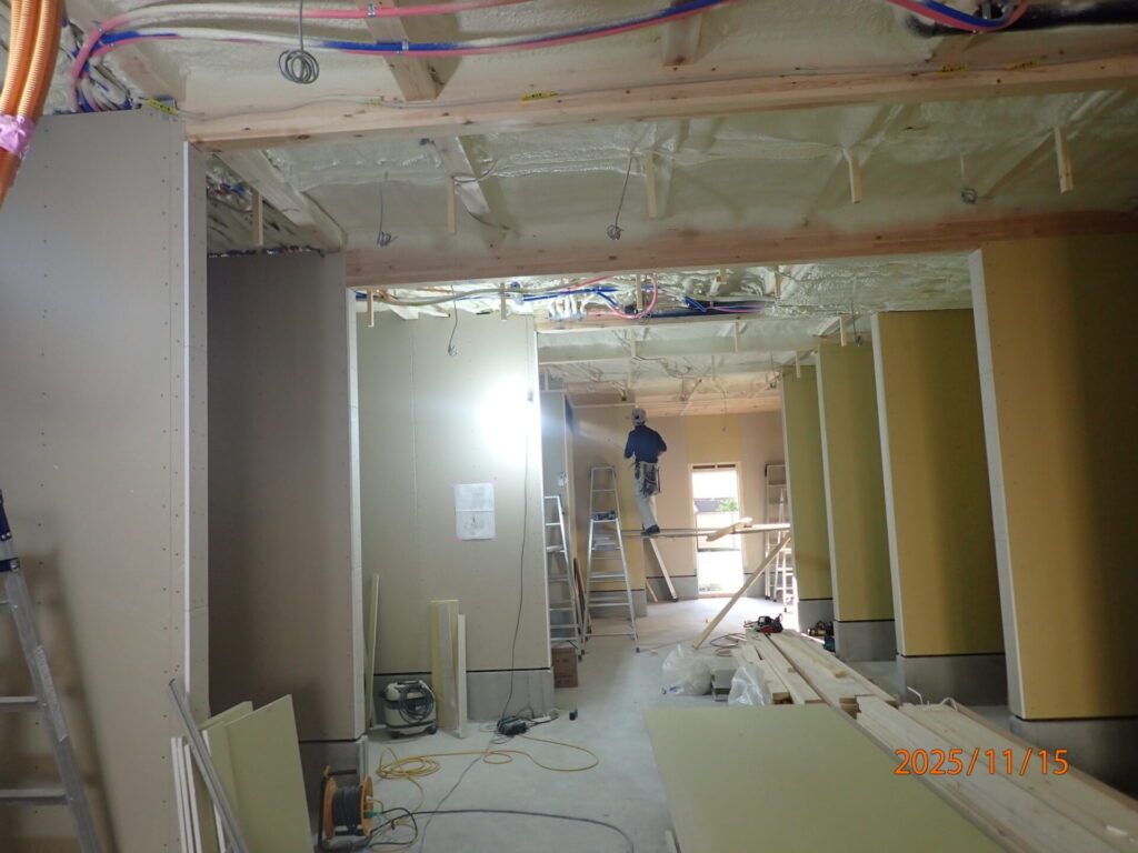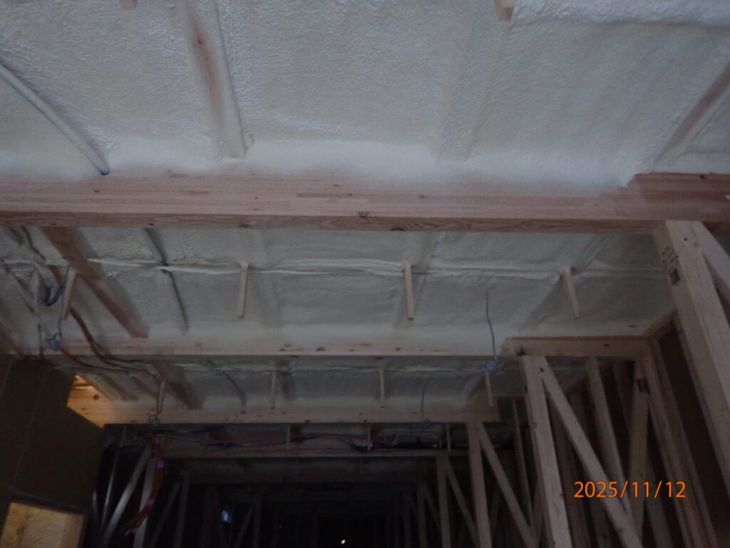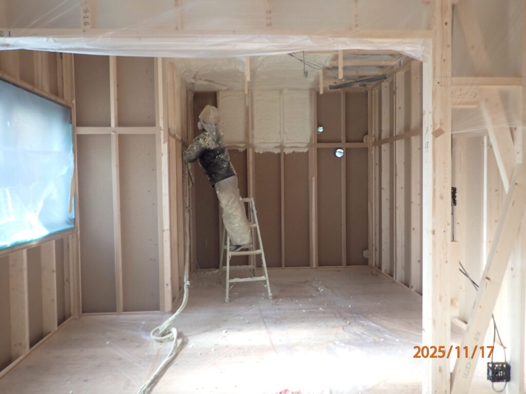 足立区本木 建替え工事。足立区注文住宅建替え&リフォーム工務店あなたの担当がいる浅野工務店の藤田です。上棟から3週間ほど経ちましたが、外部-屋根葺き・サッシ取付・防水シート張りまで完了し、3日かけて内部-ウレタン吹付工事を行なっています。2階の住居部分を囲うように、2階天井・壁・床の吹付を行い、明日、完了予定です。1階部分の吹付は、先週完了して石膏ボード張り工事中です。