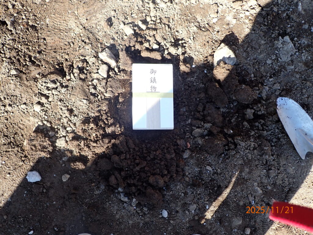 地鎮祭で神主さんにいただいた鎮め物を建物の真ん中の地中に納めました。