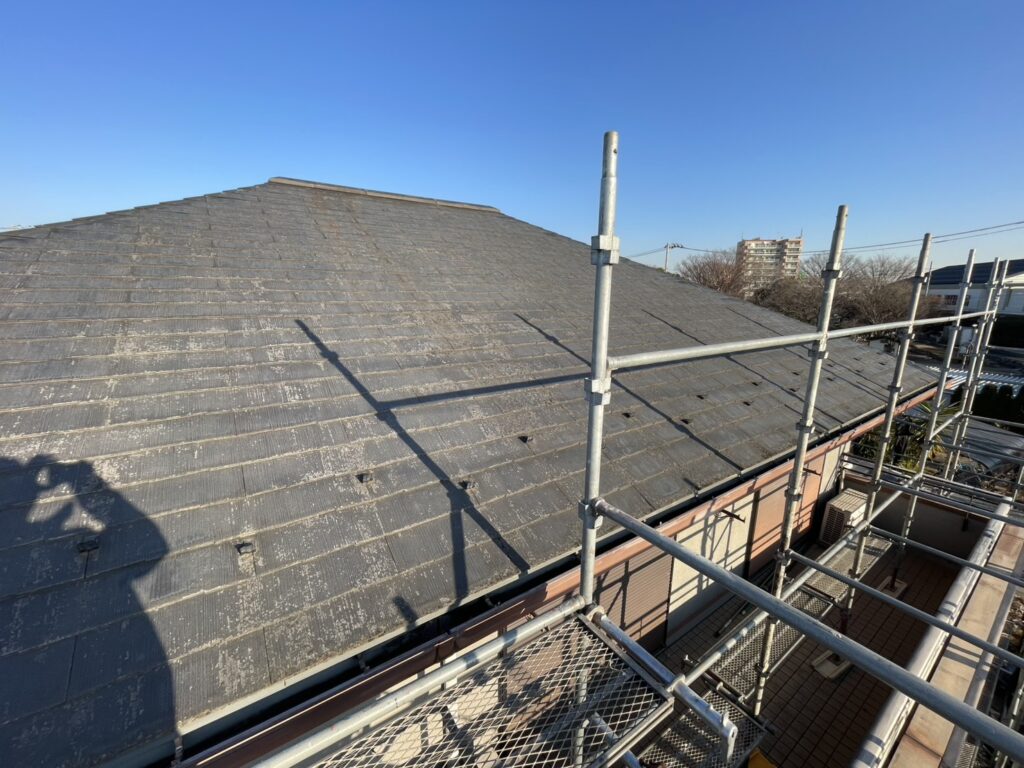 足場を組んで高圧洗浄で屋根と外壁をキレイにしました。