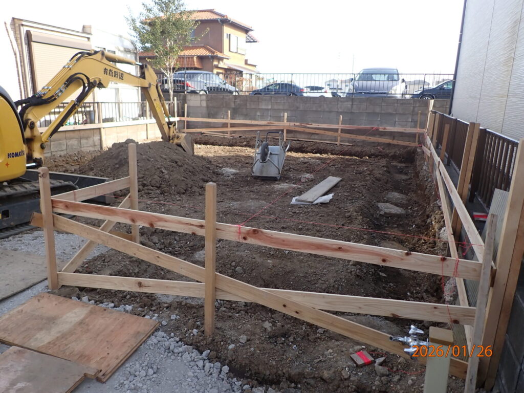 寒い日が続いていますが、いい天気がずっと続いていますので、基礎工事は順調です。