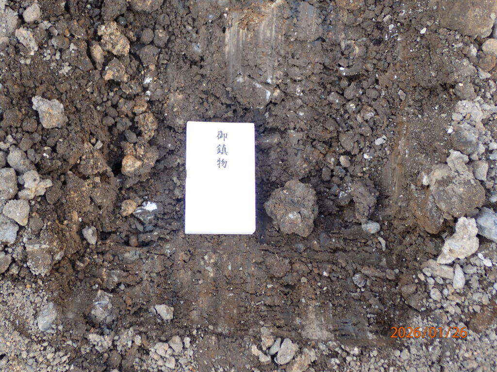 地鎮祭で神主さんにいただいた鎮物を建物の中央に納めました。