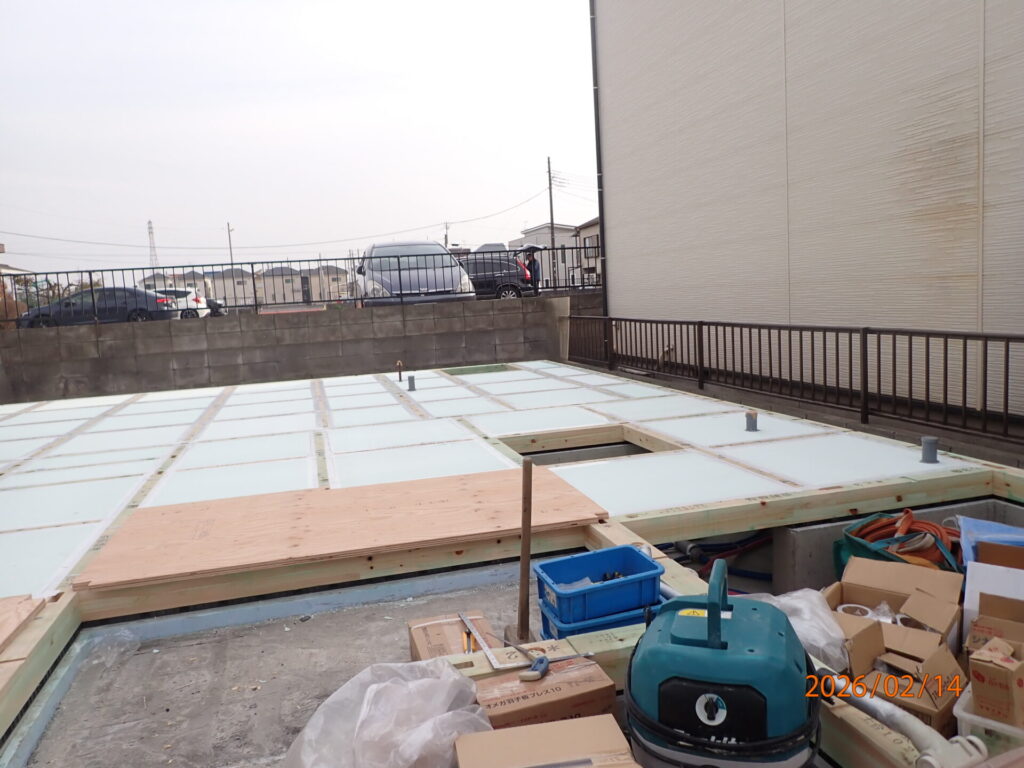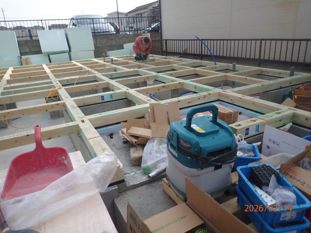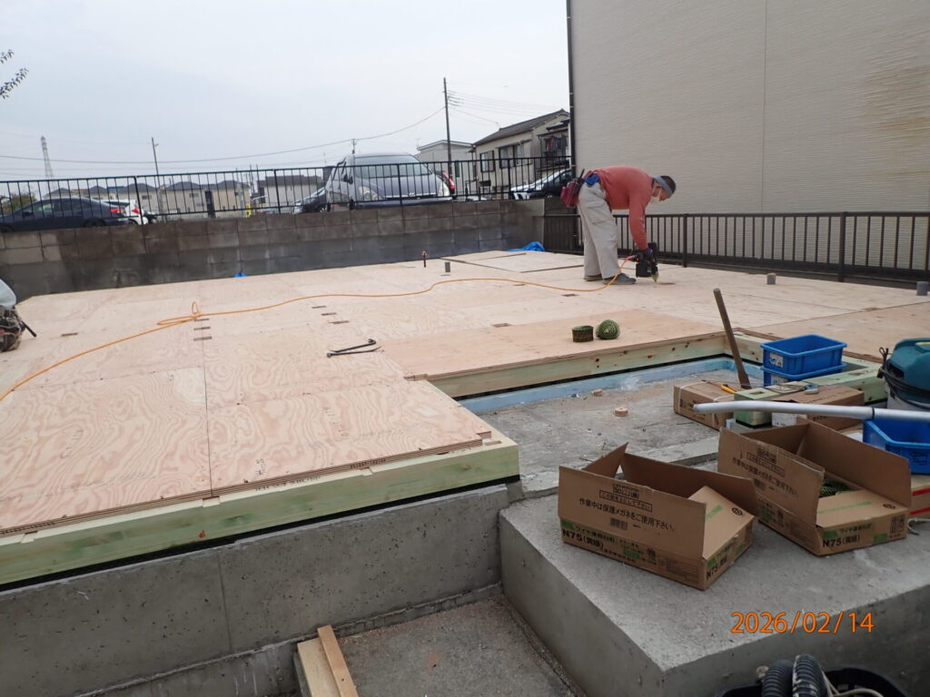 先週末に土台敷き・床断熱材入れ・床合板張りが完了して、今日、無事に上棟しました。