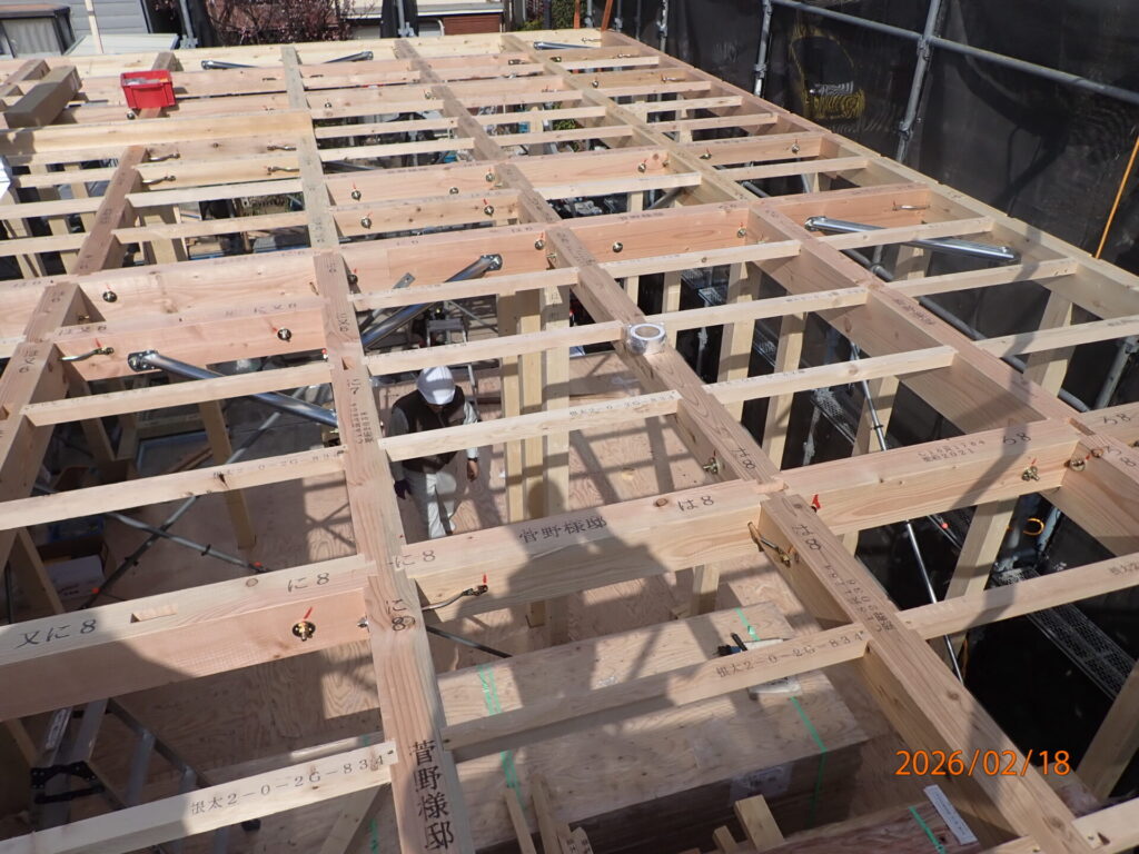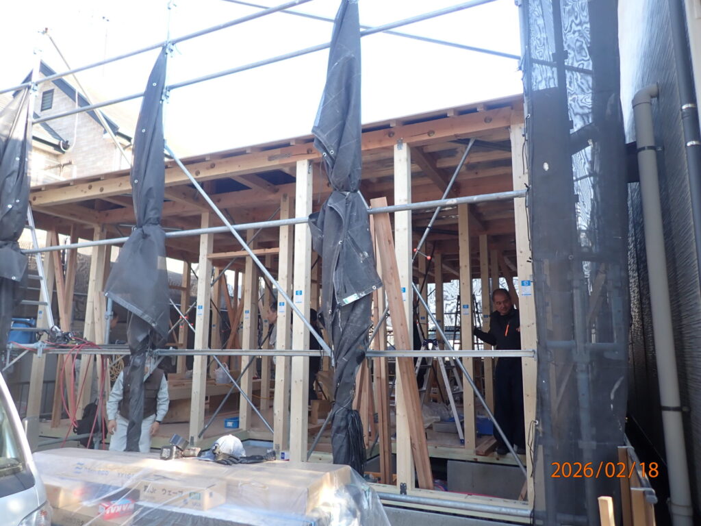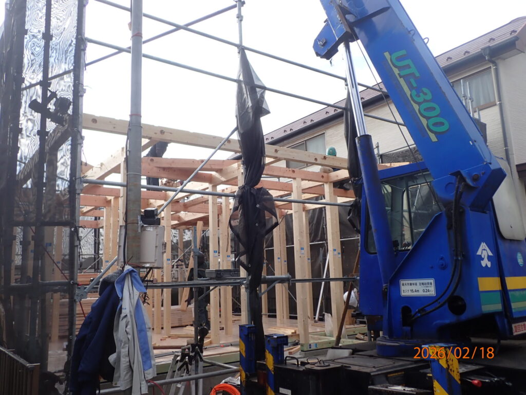 上棟日和の晴天で予定通り、屋根下地合板張り・ルーフィング張りまで完了しました。