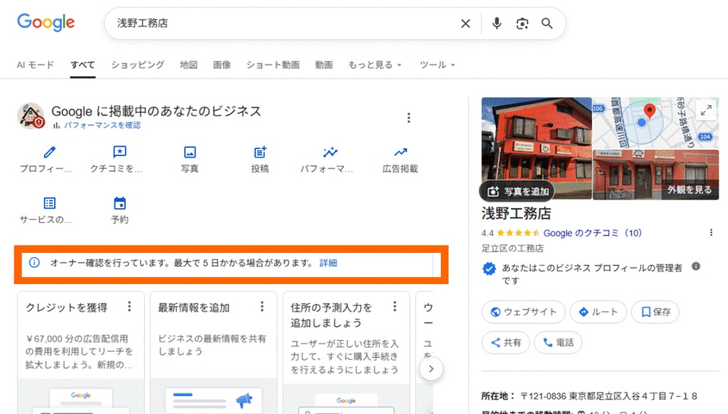 現在、当店のGoogleビジネスプロフィールが「オーナー確認待ち」の状態となり、マップ上に表示されておりません